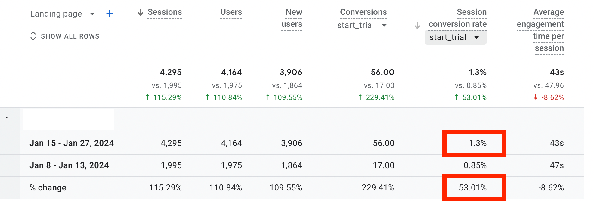 After the changes were implemented the session conversion rate ("The percentage of sessions in which any conversion event was triggered.") increased by 53%.