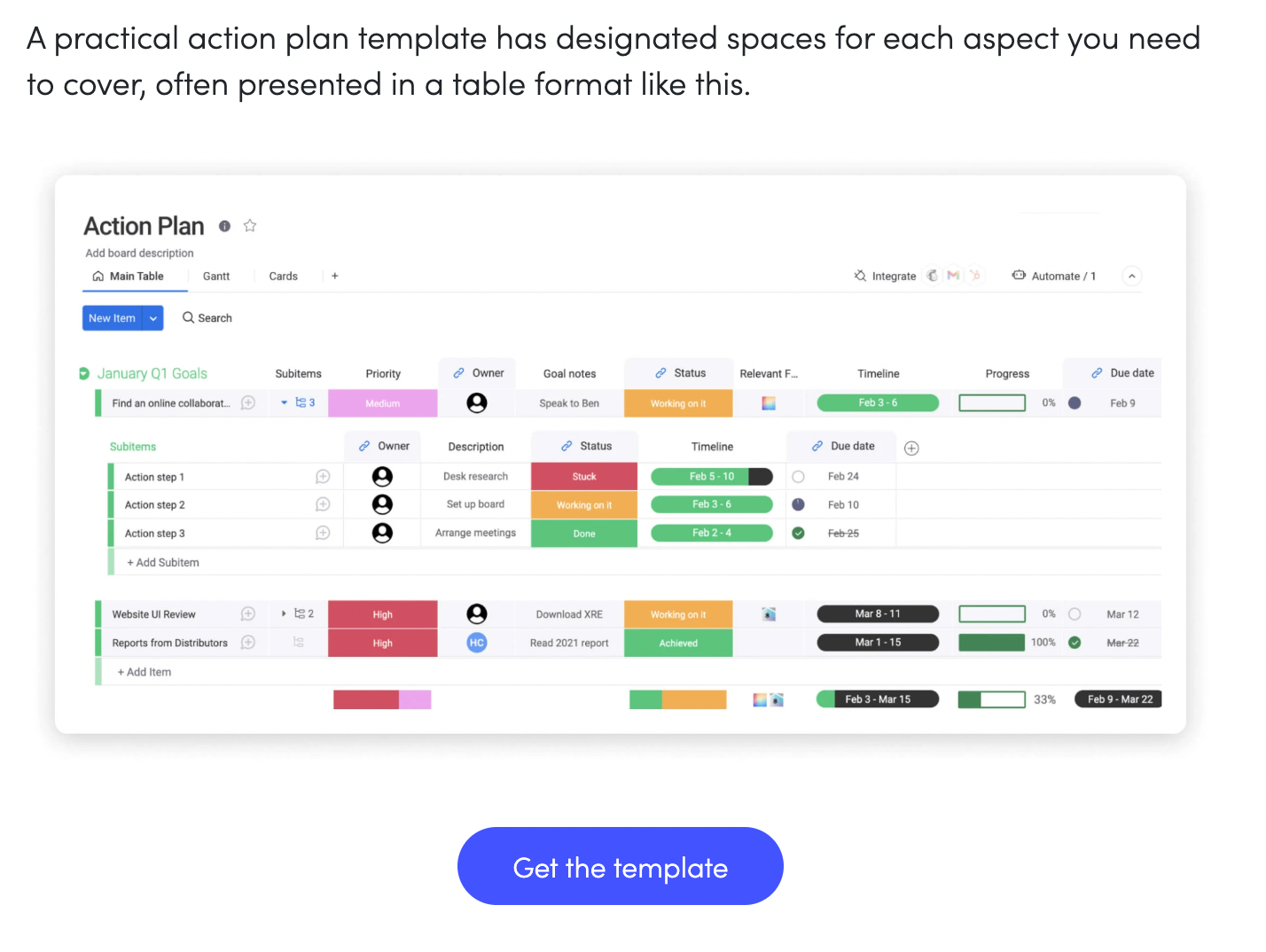 The article includes a template and a CTA. Instead of a download, you sign up and start using the template within the Monday.com platform.