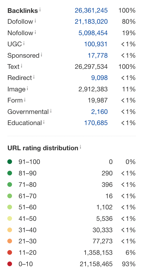 What we're looking for here is DoFollow backlinks (they have 21 million) and URL rating distribution. In this example, less than 1% of Investopedia's links come from domains with an 81-90 score.