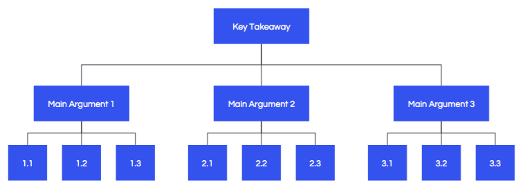 The Pyramid Principle was created by Barbara Minto at McKinsey as a method of structuring communications for maximum impact. The idea is to start with your main idea, and then use logically grouped arguments to support your position.